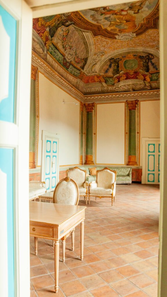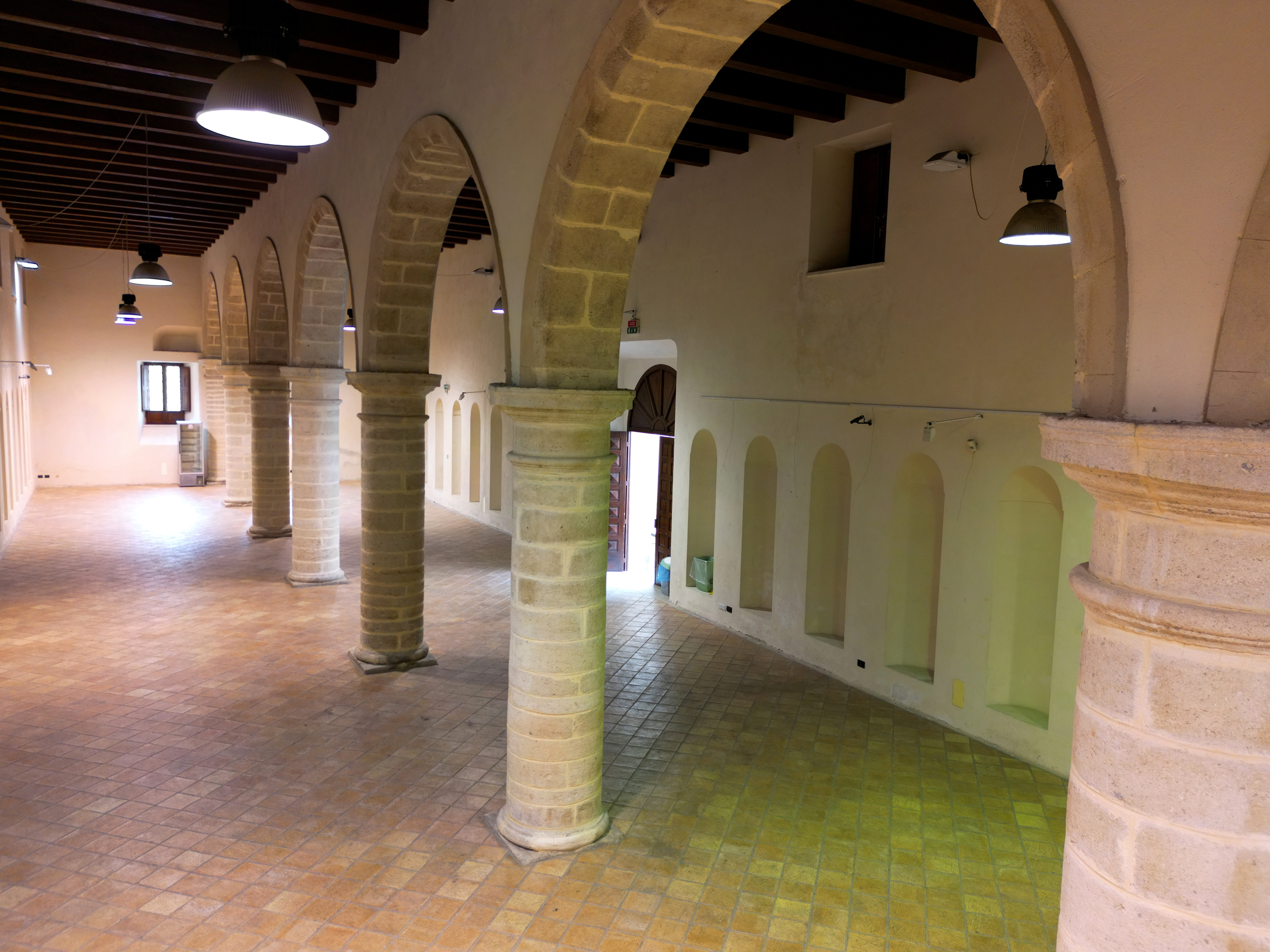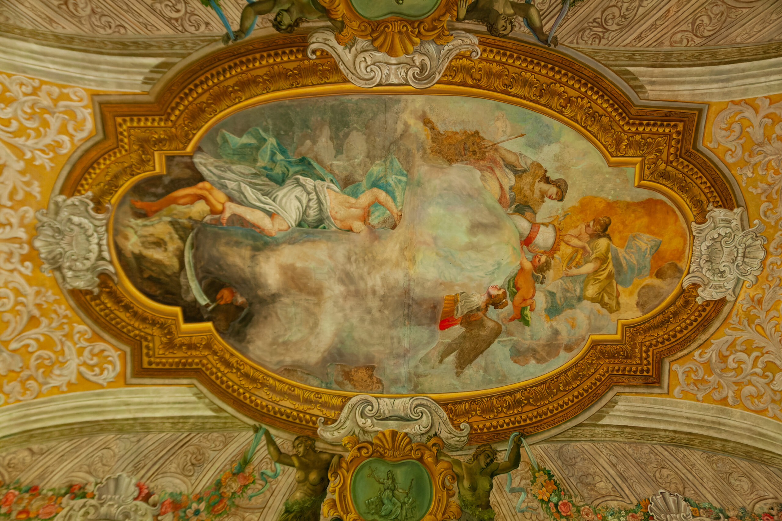 The halls on the main floor are noteworthy, with frescoes depicting the Rape of Proserpina and The Allegory of Time, which Donato Vitale built between 1714 and 1718, and the mysterious Sala delle Colonne on the ground floor, which overlooks the square-plan internal courtyard and occupies the entire east wing of the building. The enormous room is cut in half by a row of arches supported by eight stone columns in late sixteenth-century style and has forty-six niches on the longest walls whose original purpose is still controversial and would lead one to think of a pre-existing sacred building.