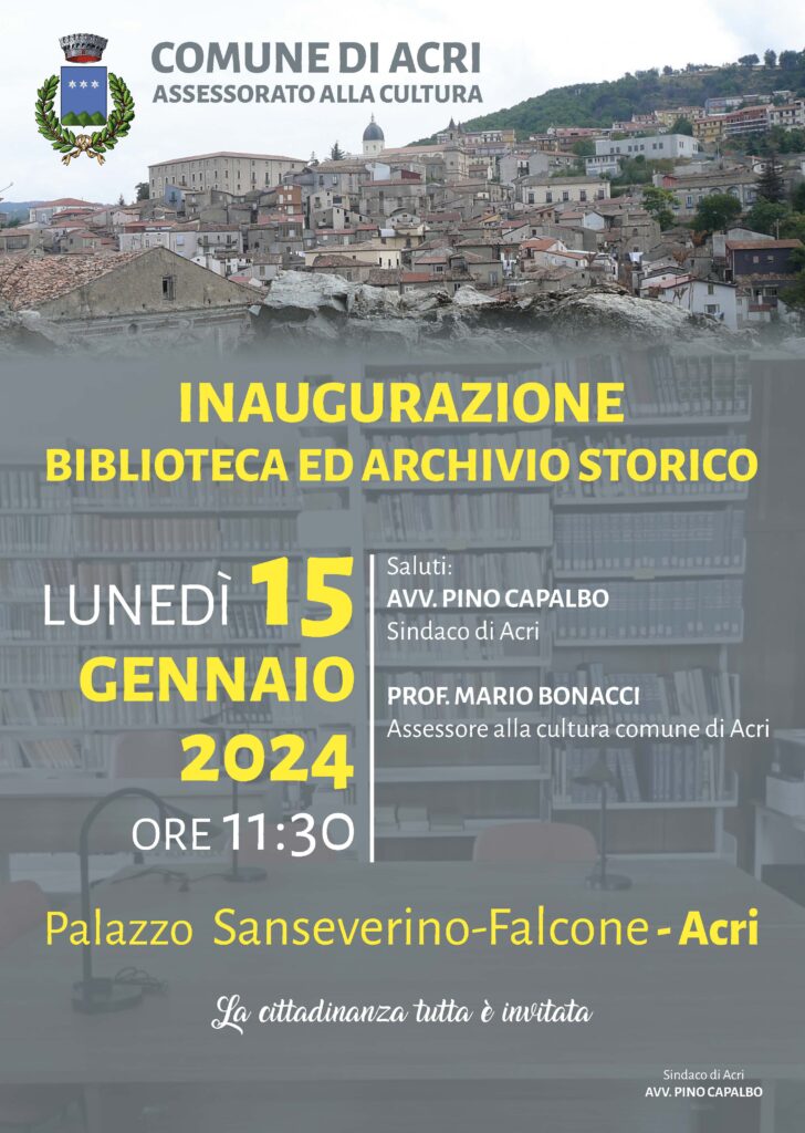 In occasione dell’inaugurazione dei nuovi locali dell’Archivio storico, sarà presentato il progetto “Biblioteca del Comune di Acri” (POR